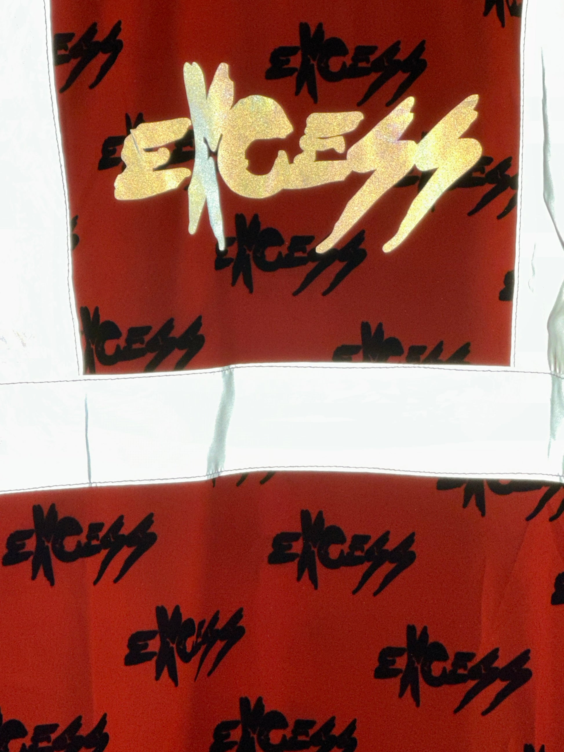 Packed with neon energy, wrapped in reflective harness stripes, and stamped repeatedly with the Excess signature — this piece blends safety, style, and statement into one unmistakable look.